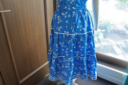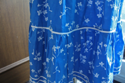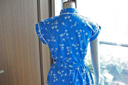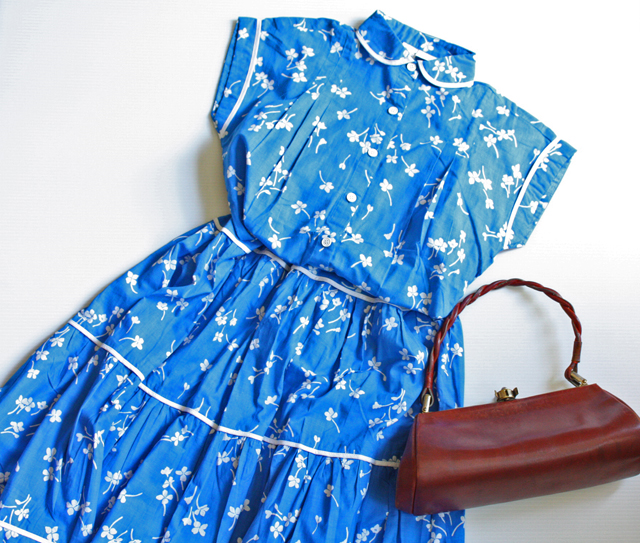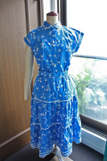デンマークで見つけたヴィンテージのコットンツーピースのセットです。こちらは鮮やかなブルーの地に素朴なクローバーがプリントされています。丸い襟とフレンチスリーブのトップと、三段のふんわりとしたフレアスカートは単品でもデニムや白いシャツなどと合わせて頂くと素敵です。ヴィンテージ古着のお好きな方、工夫を凝らしてファッションに取り入れてみませんか?セットアップを着せているトルソーサイズは、B:82.6cm、W:61cm、H:89.3cmです。