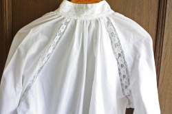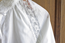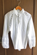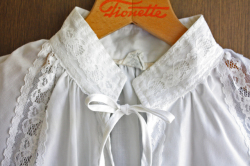 デンマークで見つけたヴィンテージのブラウスです。こちらはふんわりとしたフォルムで胸元はリボン結び、袖にはレースが施されていて、繊細なイメージです。スカートやデニムでも素敵な一枚です。ヴィンテージ古着のお好きな方、工夫を凝らしてファッションに取り入れてみませんか?素材は、ポリエステルとコットンの混紡です。