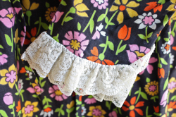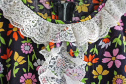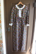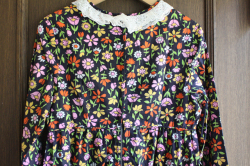 デンマークで見つけたヴィンテージのコットンワンピースです。こちらはブラックの地にカラフルなフラワーモチーフがデザインされています。襟元と袖周りには白いレースが施され、可愛いらしい印象です。ロング丈のレトロ感満載のデザインですので、ヴィンテージ古着のお好きな方、工夫を凝らしてファッションに取り入れてみませんか?
