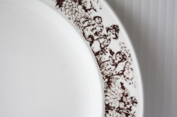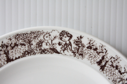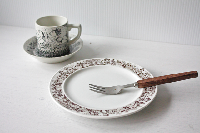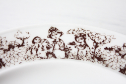 ドイツの一流ブランド、ローゼンタールのスタジオラインのケーキ皿です。 Bjorn Wiinblad(ヴィヨルン・ウィンブラッド)デザインで、可愛らしいファミリーが森の中でピクニックをしている様子が描かれています。屋外にも拘わらず陶器のカップでお茶を楽しむ姿は微笑ましく、ほのぼのとした様子が伝わります。こちらのデザインは、デンマークのニモールで活躍していた時代のタッチでデザインされたもので素朴な線描が魅力です。当店初入荷の珍しいデザインです!