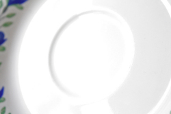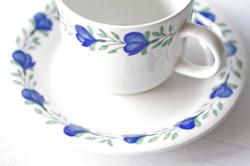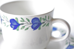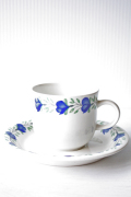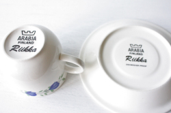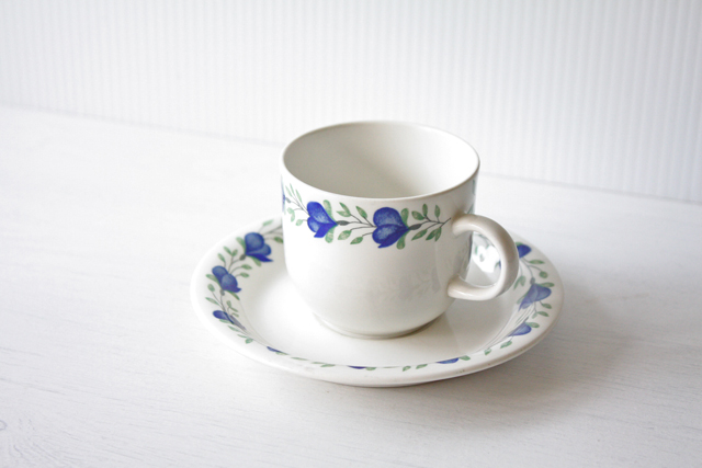 フィンランドのArabia(アラビア)社、Riikkaシリーズのカップ&ソーサーです。こちらは小ぶりのサイズでコロンとしたフォルムが可愛らしいです。コバルトブルーの深みのあるお色の花にグリーンの葉っぱの色が映えており、ぐるりとリースのようにデザインされています。こちらのシリーズは市場にもあまり出回っていない珍しいデザインですので、コレクターの方はお見逃しなく!