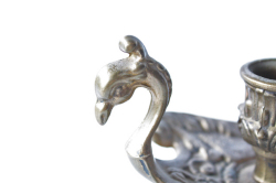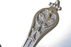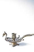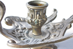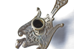 デンマークで見つけた真鍮のキャンドルホルダーです。こちらは持ち手付きのしっかりとした作りのデザインで、重厚な印象です。レースなどと一緒に飾っていただくと一層素敵です。オブジェとして飾って頂くと、落ち着いたアンティークのインテリアを演出できそうです。