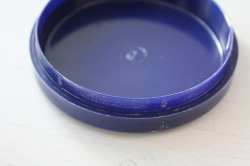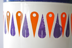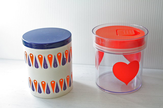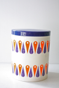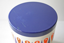 デンマークで見つけたヴィンテージのプラスティック容器です。こちらは厚みのあるプラスティック製でネイビーブルーの蓋に周りはオレンジとネイビーブルーの幾何学模様がデザインされており、レトロ感満載でキッチンに置いて、スパイスやお茶などを収納しても素敵ですね。