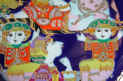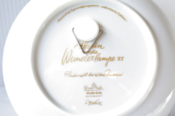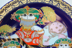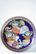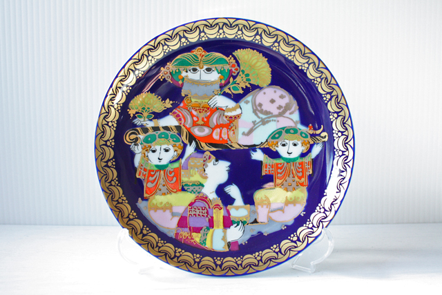デンマークの人気デザイナーBjorn Wiinblad(ヴョルン・ウィンブラッド)の美しい絵皿です。千夜一夜物語のアラジンのお話のモチーフで、神秘的なベールで顔を覆った女性が二人の踊り子を従えて横たわっている様子がデザインされています。カラフルな色彩と金彩銀彩が施された華やかなプレートです。