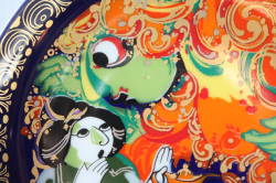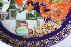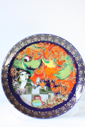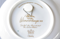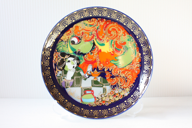 デンマークの人気デザイナーBjorn Wiinblad(ヴョルン・ウィンブラッド)の美しい絵皿です。千夜一夜物語のアラジンのお話のモチーフで、ランプから飛び出たランプの精が前面に描かれ迫力のある場面です。カラフルな色彩と金彩銀彩が施された華やかなプレートです。