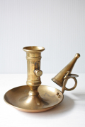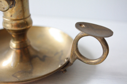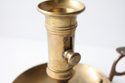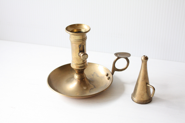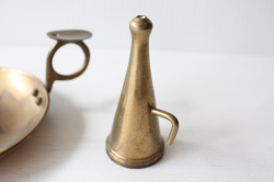 デンマークで見つけた真鍮のキャンドルホルダーです。こちらは凝った作りのどっしりしたタイプで、現行品にはないヴィンテージならではの趣があります。持ち手のあるくらっしくなデザインでオブジェとして飾って頂いても、落ち着いたアンティークのインテリアを演出できそうです。火消がセットでついていますので、実用的です。