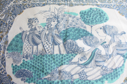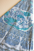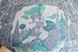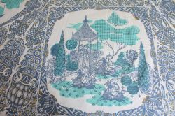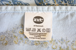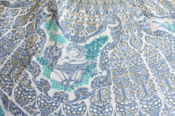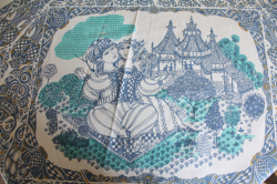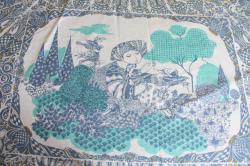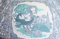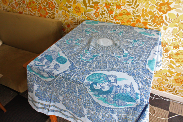 デンマークで人気のアーティスト/Bjorn Wiinblad(ヴョルン・ウィンブラッド)デザインのヴィンテージのクロスです。こちらはラウンドタイプでブルーの落ち着いたカラーにいろいろなモチーフが付いています。