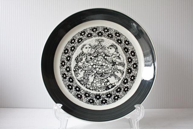 デンマークの人気デザイナーBjorn Wiinblad(ヴョルン・ウィンブラッド)の美しい絵皿です。こちらは、マンスリープレートで12か月のシリーズになっています。12月のプレートは、家族が大きなクリスマスツリーを囲んでダンスをしている様子が描かれています。周りの縁取りはフラワーモチーフでぎっしりとデザインされており、大変凝っています。細かく描かれた、ヴィヨルンの図柄には温かな雰囲気が漂います。マンスリープレートは市場でも数が少ないですのでおすすめです!
