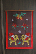 スウェーデンのコットン素材の壁掛けです。クリスマスデコレーションのわら素材のヤギに乗っているニッセがデザインされています。ハンドプリントで味わいのある雰囲気です。