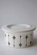 フィンランド、ARABIAの人気デザイナー、エステリ・トムラの、Kartanoの蓋付ポットです。カルタノは、フォルムデザインをPeter Winquist(ペテル・ウィンクヴィスト)が 、デコレーションデザインをEsteri Tomula (エステリ・トムラ)が手掛けたシリーズになります。 製造期間も短く、1973年 - 1976年の3年間のみの生産となり、希少なシリーズです。「kartano」とは、貴族の荘園・領地のことです。上品でシンプルなドットとラインだけでデザインが描かれており、大変素敵です。蓋つきですので、シュガーポットとして、またジャムポットとしてなどアイデア次第で多様に使って頂けそうです。市場でもあまり見かけない人気のシリーズですので、お見逃しなく!