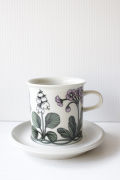 フィンランド、ARABIAのフローラシリーズのモーニングカップ&ソーサーです。パステル画の様な柔らかなタッチの野花を集めたフラワーブーケットのようで、可憐な印象です。大き目サイズのカップですのでたっぷりカフェオレやミルクティを楽しめますね。今回入荷分は使用感はあまりなく、コンディションにこだわる方におススメです。