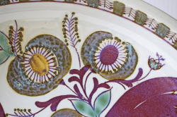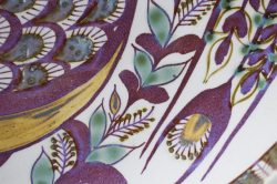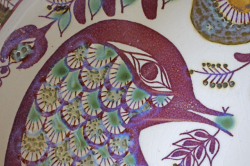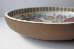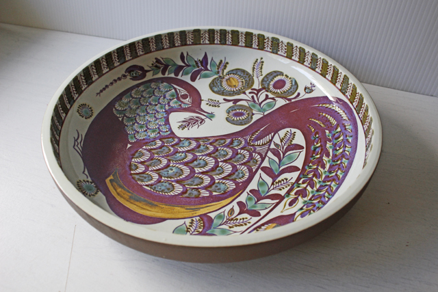 デンマーク、Royal Copenhagenテネラシリーズの丸ボウルです。ニルストーソン率いる6名の若手女性デザイナーにより1958年から製作されたシリーズです。鳥や花々が生き生きと描かれたパワフルな作風が魅力です。こちらはデンマーク出身のデザイナー、Berte Jessenの作品でグリーンやパープルを使い華やかに鳥が描かれています。画面いっぱいに描かれた鳥は、躍動感があり神秘的な色合いとマッチしています。サイズも特大で大きく散らし寿司など大皿料理にもぴったりです。