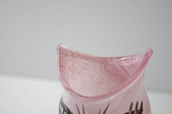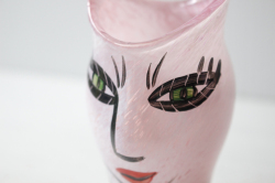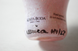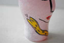 スウェーデン、コスタボダ社製のヴィンテージガラスのハンドペイントの花瓶です。こちらはピンクのマーブル地にユニークな表情の顔がデザインされており、大変個性的です。小振りな作品ながら目力に圧倒されます。飾りやすいサイズですよ。ハンドメイドで作られており、アートピースですので、コレクションされても素敵ですね。独特の世界観を持つウルリカの作品は、一度はまるとコレクションされる方が多くいらっしゃいます。