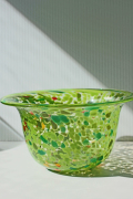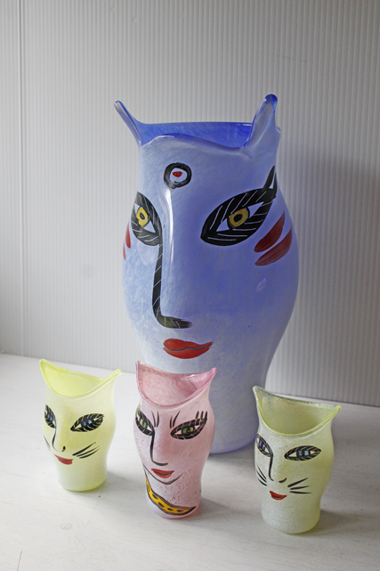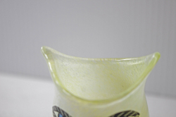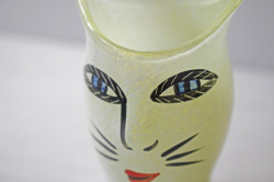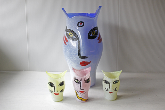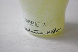 スウェーデン、コスタボダ社製のヴィンテージガラスのハンドペイントの花瓶です。こちらはアップルグリーン(イエロー寄りの)のマーブル地にユニークな表情の顔がデザインされており、大変個性的です。小振りな作品ながら目力に圧倒されます。飾りやすいサイズですよ。ハンドメイドで作られており、アートピースですので、コレクションされても素敵ですね。独特の世界観を持つウルリカの作品は、一度はまるとコレクションされる方が多くいらっしゃいます。