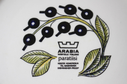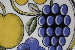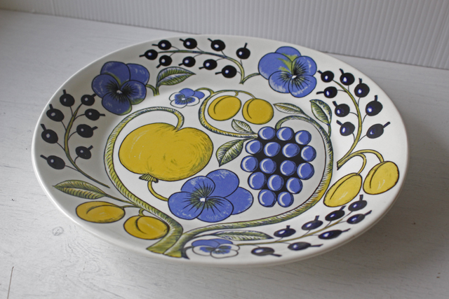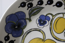 フィンランド、ARABIA/ビルガー・カイピアイネンデザインのオーバルプレートです。パンジー、カシス、ぶどう、リンゴなどを華やかに描き、paratiisi=「paradise(楽園)」を表現したのがこちらのパラテッィシカラーシリーズです。一旦1974年に生産終了し、1988年に復刻されました。色合いも現行品とは異なり、ヴィンテージのオリジナル品はパンジーのブルーが柔らかなので一目瞭然です。初期のオリジナルは裏面の刻印もカラーです。初期のオリジナルは市場でもなかなか見かけないお品です。
