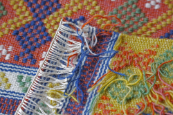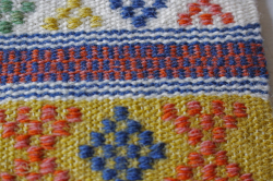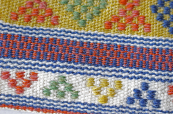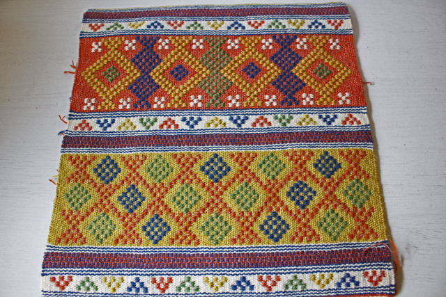スウェーデン製の織物です。カラフルな暖色系の配色の幾何学模様が素敵なデザインです。直接壁にピンでとめたり、額装したり、オブジェの敷物として使ったりといろいろお使いいただけます。