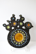 スウェーデン、GUSTAVSBERG(グスタフスベリ)の陶板の壁掛けです。ほぼすべてを円で表現した独創的なデザインで、5羽のひな鳥を背中に乗せた鳥の親子です。シックで落ち着いたダークブラウンとグリーンやブルーの鮮やかなお色がマッチした作品です。裏面には壁掛け用の針金がついています。