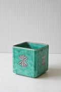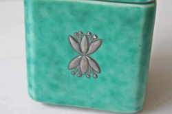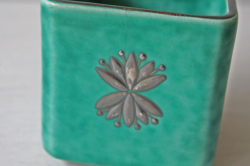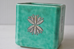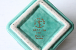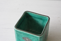 スウェーデン、グスタフスベリのWilhelm Kageデザインの角ミニ花瓶です。ARGENTAというエメラルドグリーンのマットな釉薬と純銀の銀彩が施されたクラシックなシリーズです。丸みのある角皿に小花がデザインされています。そのままオブジェとして飾っても、オアシスを入れてアレンジメントにしていただいてもよいでしょう。