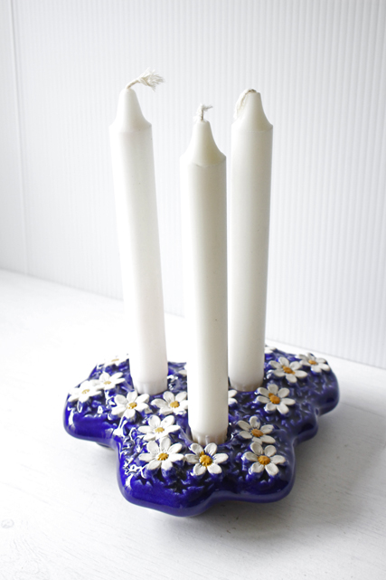 スウェーデンのjie gantofta社製の陶器のキャンドルホルダーです。こちらは白の小花が咲きほこっているような可愛らしく華やかなデザインとなっています。キャンドルは3本立てることができます。サービスでキャンドルをお付けします。