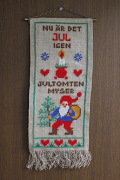 丁寧な手刺繍が施されたヴィンテージの壁掛けです。ざっくりしたダークベージュ生地にクロスステッチでニッセやクリスマスモチーフがたくさんデザインされています。スウェーデンでクリスマスに灯される赤の丸っこいキャンドルホルダーやプレゼントを運ぶニッセ、幸せの象徴のハートなど、可愛らしいモチーフとカラフルな色合いが素敵です。