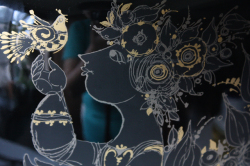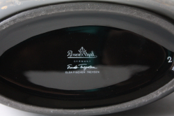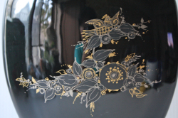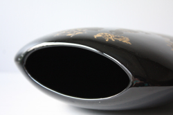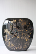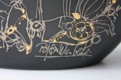 デンマークの人気のアーティスト/Bjorn Wiinblad(ヴョルン・ウィンブラッド)の花瓶です。漆黒の地に金彩でエキゾチックな女性がデザインされています。女性の縁取りの内側はつや消しの黒になっておりメリハリの利いた仕上がりとなっています。オブジェとしても楽しめる存在感のあるお品です。