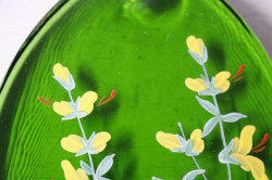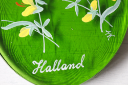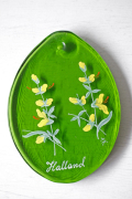 スウェーデン製、ヴィンテージガラスのサンキャッチャーです。スウェーデン各地方名と県花がハンドペイントで描かれています。涙型の美しいクリアグリーン、素朴なかわいらしさを感じていただけるお品です。吊り下げの穴が開いているので、壁や窓辺に飾っていただけます。