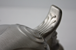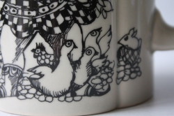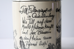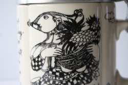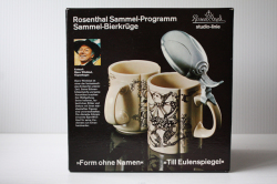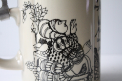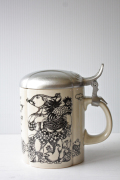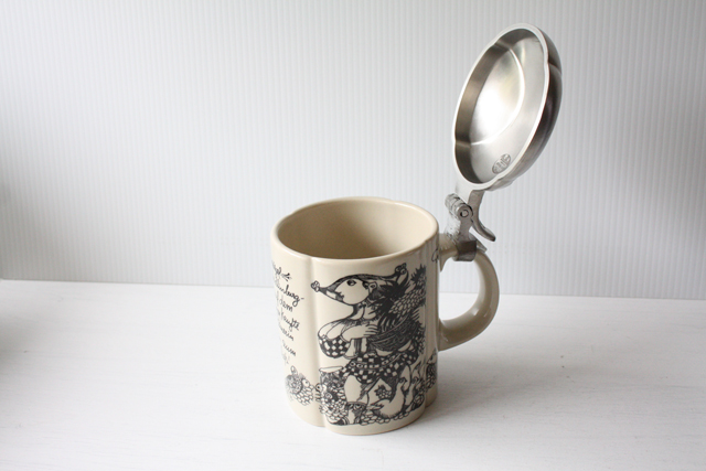 ドイツの一流ブランド、ローゼンタールのスタジオラインにて製造されたデンマークの人気デザイナーBjorn Wiinblad(ヴョルン・ウィンブラッド)のピューター製のふた付きビアマグです。ティル・オイレンシュピーゲル(1350年没)という14世紀の北ドイツに実在していた伝記の奇人が手がけた物語のワンシーンを描いたものになります。彼の生涯が長年口頭で言い伝えられたのち彼の死後から100年ほどして、、“ふくろうと鏡”というタイトルで物語は出版されました。その中の一つのシーンがお皿には描かれています。彼の姿は道化師のように描かれるらしく、このイラストも道化師が描かれています。マグのフォルムも丸みがあり、プクプクとしたお花の様な形となっています。今回入荷分は新品未使用でコンディションもよいのでおススメです。