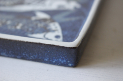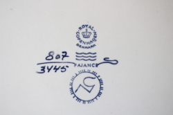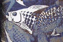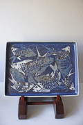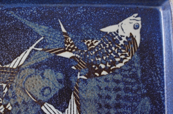 デンマーク、Royal Copenhagen(ロイヤルコペンハーゲン)の大判角皿です。こちらは、Nils Thorsson(ニルス・トーソン)デザインの作品です。画面いっぱいに魚が所狭しと泳いでいる様子が迫力満点に描かれています。艶消しの北欧ブルーは作品に味わいと上品さを与えています。和陶器に憧れたデザイナーたちがこぞって和陶器を学んだ当時の作風がよくあらわれた作品ですね。当店初入荷の珍しいお品です。