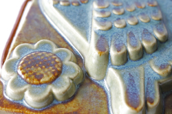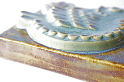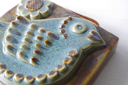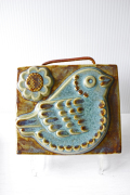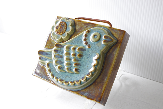 スウェーデン、EGO社の陶板の壁掛けです。小鳥とお花がデザインされた本当に愛らしい作品で、ブラウンとブルーの組み合わせが落ち着いた雰囲気も醸しています。画面から飛び出したように立体的に作られています。EGO社の作品は市場でも少なく希少になっております。お探しの方はお見逃しなく。上部に壁掛け用の穴が開いているので、革ひもなどを付けていただければ吊り下げて飾ることができます。