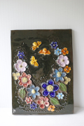 スウェーデンのjie gantofta社製の陶器の壁掛けです。モスグリーンのシックなカラーの背景に可愛らしいフラワーモチーフと蝶々が描かれています。裏面には、壁に掛ける穴が開いています。大きなサイズですので、インテリアのアクセントにピッタリです。