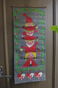 スウェーデンで活躍したデザイナーの布で製作された壁掛けです。黄麻(ジュート)生地にニッセが折り重なってクリスマスツリーを表現しているユニークなデザインです。周りにはヒイラギやハートモチーフのオーナメントが配置されていて華やかで可愛いです。