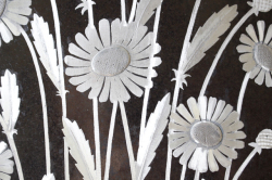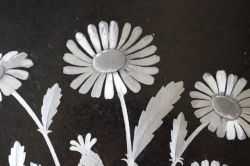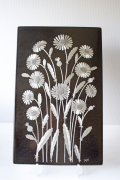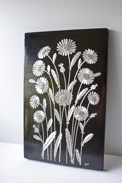 スウェーデン、GUSTAVSBERG(グスタフスベリ)の陶板です。こちらはダークブラウンの地にフラワーモチーフが銀彩でデザインされています。同社にデザイナーとして招かれたドイツ人Heinz Erretのデザインで1970年代から80年代にかけて、スウェーデン各地のフラワーモチーフをデザインした作品です。高級感もあり、美しくお部屋がエレガントに飾られお勧めです。
