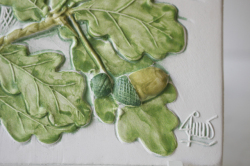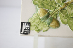 スウェーデンのjie gantofta社製の陶器の壁掛けです。Jieの陶板は可憐なお花がデザインされているものが多く、可愛らしいものからシックなものまでお気に入りを見つけてください。複数枚、組み合わせて飾るのも素敵です。裏面には、壁に掛ける穴が開いています。こちらは白地の珍しいタイプで可憐などんぐりモチーフが愛らしいです。
