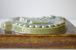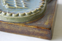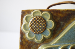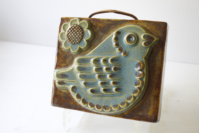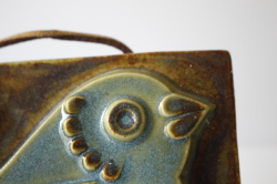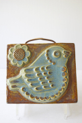 スウェーデン、EGO社の陶板の壁掛けです。小鳥とお花がデザインされた本当に愛らしい作品で、ブラウンとブルーの組み合わせが落ち着いた雰囲気も醸しています。画面から飛び出したように立体的に作られています。EGO社の作品は市場でも少なく希少になっております。お探しの方はお見逃しなく。上部に壁掛け用の穴が開いているので、革ひもなどを付けていただければ吊り下げて飾ることができます。