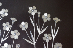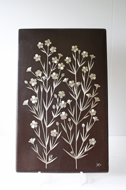 スウェーデン、GUSTAVSBERG(グスタフスベリ)の陶板です。こちらはダークブラウンの地にフラワーモチーフが銀彩でデザインされています。同社にデザイナーとして招かれたドイツ人Heinz Erretのデザインで1970年代から80年代にかけて、スウェーデン各地のフラワーモチーフをデザインした作品です。高級感もあり、美しくお部屋がエレガントに飾られお勧めです。