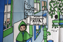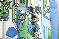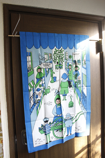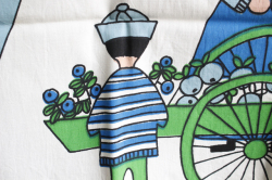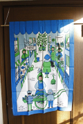 スウェーデンで1959年からテキスタイルデザイナーとして活躍したUllasデザインのヴィンテージ壁掛けです。お花屋さんや魚屋さん、果物屋さんなどが並ぶ通りをお買い物する人たちがデザインされています。Ullasならではのユニークなタッチと、ハンドプリントの味わいがマッチした楽しい作品です。上部には棒が通せるようになっていますので壁掛けにしていただけます。大判サイズで迫力があります。撮影用の棒は付属しません。