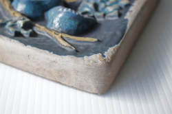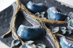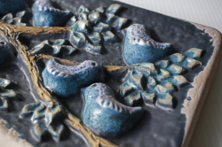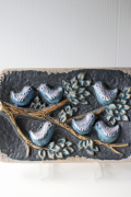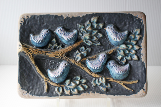 スウェーデンのNorrmans Keramik社製の陶板の壁掛けです。フレームから飛び出したような立体的な作品で、可愛らしい小鳥さんが木々にとまっています。ハンドペイントでお色も味わいがあります。裏面には、壁に掛ける穴が開いています。