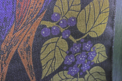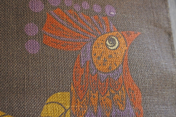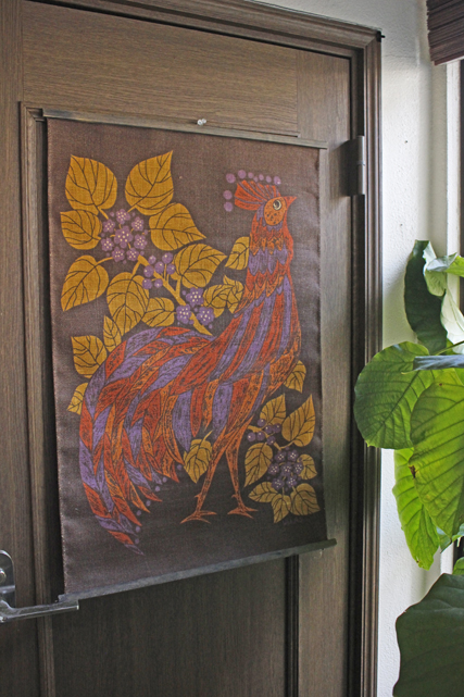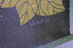 1960年から1980年代にスウェーデンで活躍したデザイナーULLASデザインの壁掛けです。黄麻(ジュート)生地に大柄の雄鶏とベリーの実がデザインされています。大きめのサイズなので、ソファ後ろの壁にアクセントとして飾っていただくとよいでしょう。このような大きなサイズの壁掛けは市場でも見かけなくなってきています。お好きな方はぜひ~