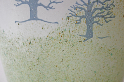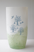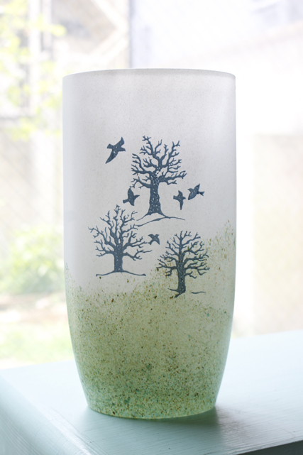 スウェーデン、コスタボダ社製のヴィンテージガラスのオーバル型花瓶です。こちらは、Kjell Engmanデザインのオクトーバーというタイトルが付いた作品です。オーバルのフォルムに秋の枯れ木に鳥が舞っている風景がモチーフになっています。ブルーグレーやグリーンなど淡い色彩で、優しくお部屋を彩ってくれそうです。大きめの存在感のあるサイズで、枝ものなどを生けていただいても映えこれからの季節にぴったりの爽やかな配色が魅力です。