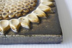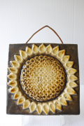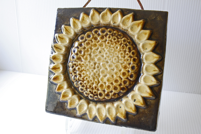 スウェーデン、EGO社の陶板の壁掛けです。ヒマワリがデザインされた愛らしい作品で、ブラウンとイエローの組み合わせが落ち着いた雰囲気も醸しています。EGO社の作品は市場でも少なく希少になっておりお探しの方はお見逃しなく。上部に壁掛け用の穴が開いているので、革ひもなどを付けていただければ吊り下げて飾ることができます。