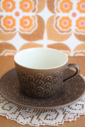 デンマーク、Jens.H.Quistgaard(イェンス・クイストゴー)デザイン「Plum」シリーズのカップ&ソーサーです。杏の花の可愛らしいモチーフでありながら、チョコレートブラウンの落ち着いた色合いが甘くなりすぎず素敵です。ツヤのないマットな釉薬が使われており、見ていてホッと和む雰囲気を持っています。