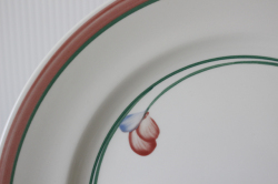 スウェーデン、Rorstrand(ロールストランド)、JENNYシリーズのディナープレートです。丸みのあるフォルムにハンドペイントでピンクやミントグリーンのお花やラインが絵付けされています。パステルカラーの優しい雰囲気が曲線の美しいフォルムともよく合っています。ハンドペイントならではの個々の異なるタッチや線描の細さ、刷毛目の美しさなどお楽しみいただけます。朝食のプレートに、夕食のメイン料理に多様にお使いいただけます。