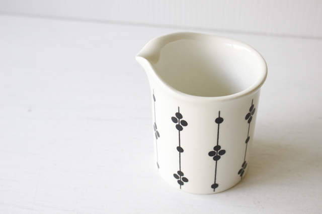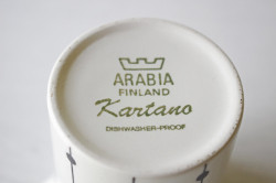 フィンランド、ARABIAの人気デザイナー、エステリ・トムラの、Kartanoのクリーマーです。カルタノは、フォルムデザインをPeter Winquist(ペテル・ウィンクヴィスト)が 、デコレーションデザインをEsteri Tomula (エステリ・トムラ)が手掛けたシリーズになります。 製造期間も短く、1973年 - 1976年の3年間のみの生産となり、希少なシリーズです。「kartano」とは、貴族の荘園・領地のことです。上品でシンプルなドットとラインだけでデザインが描かれており、大変素敵です。市場でもあまり見かけない人気のシリーズですので、お見逃しなく!