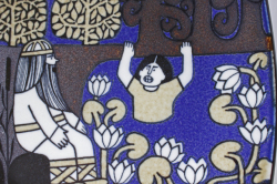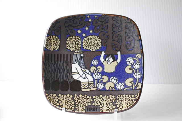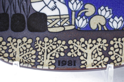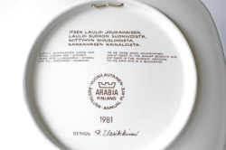 ARABIAのイヤープレートです。こちらは、フィンランドの抒情詩「カレワラ」を題材にして製作されています。1976年から1999年までの合計24枚にわたるシリーズです。デザイナーはライヤ・ウォシッキネンで彼女らしい緻密で温かな背景に人物の優しい眼差しがこちらの作品の魅力となっています。裏面には、フィンランド語、スウェーデン語、英語で絵柄のシーンの詩が書かれています。