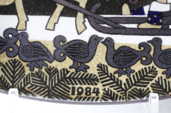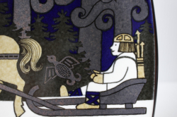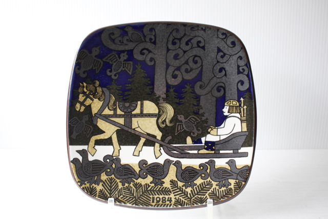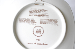 ARABIAのイヤープレートです。こちらは、フィンランドの抒情詩「カレワラ」を題材にして製作されています。1976年から1999年までの合計24枚にわたるシリーズです。デザイナーはライヤ・ウォシッキネンで彼女らしい緻密で温かな背景に人物の優しい眼差しがこちらの作品の魅力となっています。裏面には、フィンランド語、スウェーデン語、英語で絵柄のシーンの詩が書かれています。