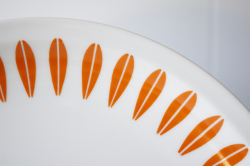 1936年~1969年という短い間しか存在しなかった、デンマークのLyngby Porcelain(リュンビュー・ポーセリン)のロータス柄のデザートプレートです。こちらは、ノルウェーのキャサリンホルム社の協力で製作されたものです。飾って楽しみたいほど、カジュアルでポップな雰囲気です。朝食にパンやスクランブルエッグをのせて毎日使いたいですね。