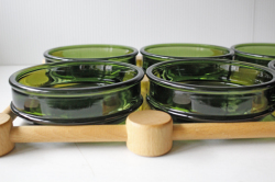 デンマーク、Nissen社の木製トレイとガラス容器6個セットです。Nissenは、イェンスクイストゴーデザインの陶器メーカーとしてもペタペタではお馴染みですがガラス製品も製作していたようです。こちらは深いグリーンが美しいボウルが6つあり、オードブルや酒肴などを盛り、おもてなしに活躍してくれそうです。ボウルはスタッキングできるので収納にも便利です。6つセットは迫力もあり、大変存在感があります!