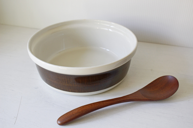 スウェーデン、Rorstrand(ロールストランド)の「KOKA」(男の子の意)シリーズ、ブラウンのボウルです。Hertha Bengtsson(ヘルサ・ベングトソン)デザインの人気シリーズです。清々しい白磁に温かみのあるブラウンのリーフ柄がぐるりとデザインされています。程よいサイズで多彩な料理を盛り付けることが出来ます。