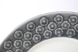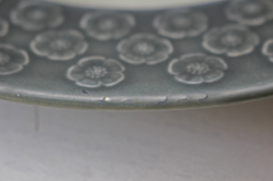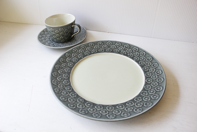 デンマーク、Jens.H.Quistgaard(イェンス・クイストゴー)デザインAzur(アズール)シリーズのディナープレートです。杏の花の可愛らしいモチーフでありながら、ブルーグレーの落ち着いた色合いが甘くなりすぎず素敵です。マットな釉薬が使われており、見ていてホッと和む雰囲気を持っています。アズールシリーズは、デンマークでも品薄で年々入手が困難になっています。こちらはディナープレートで大きさも厚みもあり、存在感たっぷりです。