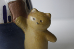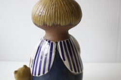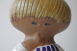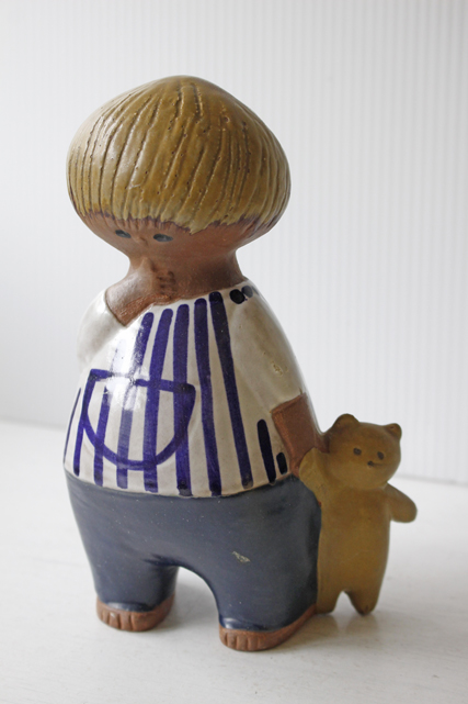 スウェーデン、リサ・ラーソン(Lisa Larson)の女の子、Malinのオブジェです。近年リサラーソンのオブジェは復刻されているものも多く、人気の高いアイテムになりますが、こちらは当時のヴィンテージの物になります。ボーイッシュなマッシュルームヘアのMalinちゃんが眠そうな表情で指を加え、大好きなテディベアを手に持って佇んでいる姿が愛らしく、甘えんぼでとてもほっこりとするオブジェです。こちらのシリーズは6人の個性的な子供たちがあり、大きめで存在感があります。